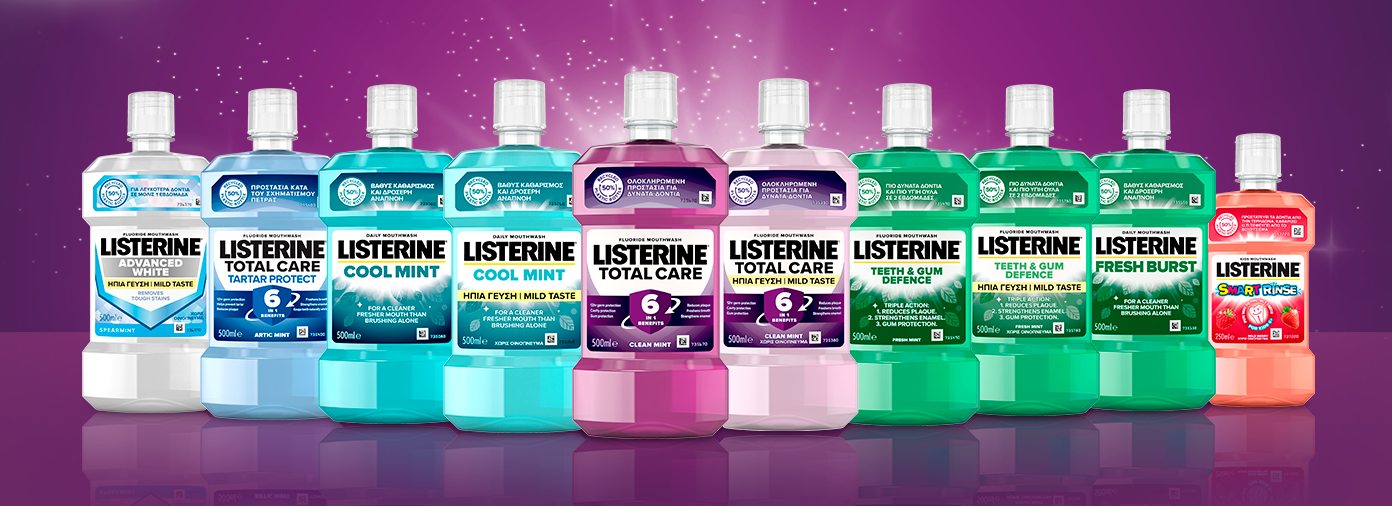 Το βούρτσισμα των δοντιών σας δεν είναι αρκετό για τη διατήρηση της καλής στοματικής υγιεινής, καθώς καθαρίζει μόνο το 25% του στόματός σας. Το LISTERINE® σας προσφέρει μια πλήρη γκάμα στοματικών διαλυμάτων, με τα οποία μπορείτε να καθαρίσετε σχεδόν το 100% του στόματος σας, ακόμη και τις πιο δυσπρόσιτες περιοχές! Επιλέξτε τα στοματικά διαλύματα που ταιριάζουν καλύτερα στις γεύσεις και στις ανάγκες σας: LISTERINE® Total Care, LISTERINE® Teeth and Gum Defense, LISTERINE® Advanced White για εντατική φροντίδα κατά τη διάρκεια της νύχτας… και πολλά άλλα!